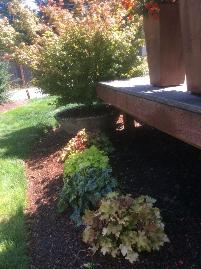 I gave the heuchera the same treatment as its fancy cousins in the narrow bed that borders the deck in my back yard but the little lime green beauty didn’t respond. It looked underdeveloped, wimpy and sad. But, before I dug it up and gave it last rites in the compost bin, I decided to give it one last, one last chance. I transplanted it a mere four feet over, next to the aggregate planter that held my pride and joy, Japanese maple.